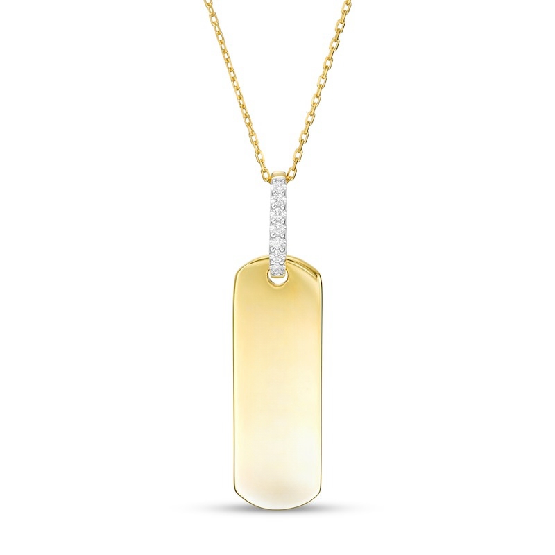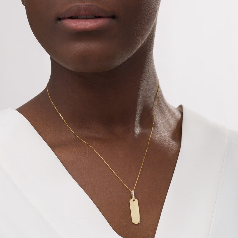Wear your values with pride with this statement-making diamond pendant. Crafted in warm 10K gold, this petite tag features the word inscribed vertically along the center. Diamonds line the bail for a hint of sparkle. Captivating with 1/20 ct. t.w. of diamonds and a bright polished shine, this pendant suspends along a 16.0-inch cable chain with 2.0-inch extender that secures with a spring-ring clasp. This exclusive fine jewelry collection inspires you to wear your strength, confidence and power.