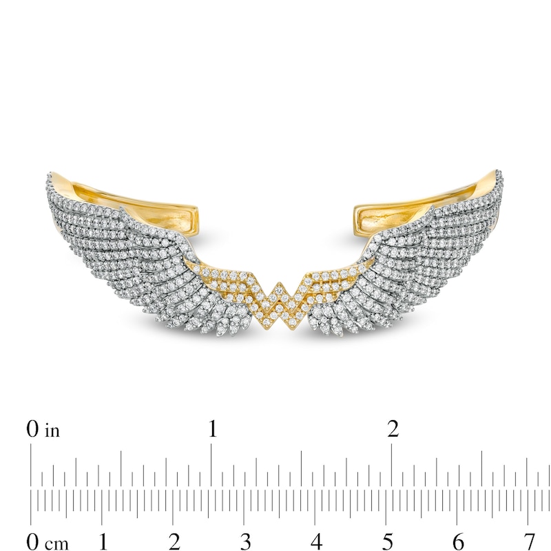 Soar to new heights in style with this show-stopping diamond wing bangle. Crafted in warm 10K gold, this dazzling design features layered feathers decked with shimmering diamonds. At the center, the logo sparkles with diamond-studded detail. Spectacular with 3 cts. t.w. of diamonds and a brilliant buffed luster, this bracelet measures 7.25 inches in circumference and slips on and off for easy wear. Embodying strength and grace, This exclusive fine jewelry collection inspires you to wear your strength, confidence and power.