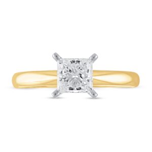 An exquisite princess-cut diamond sparkles and makes this solitaire engagement ring stand out on the gorgoeus 14K yellow gold band. The ring has a total diamond weight of 1 carat.