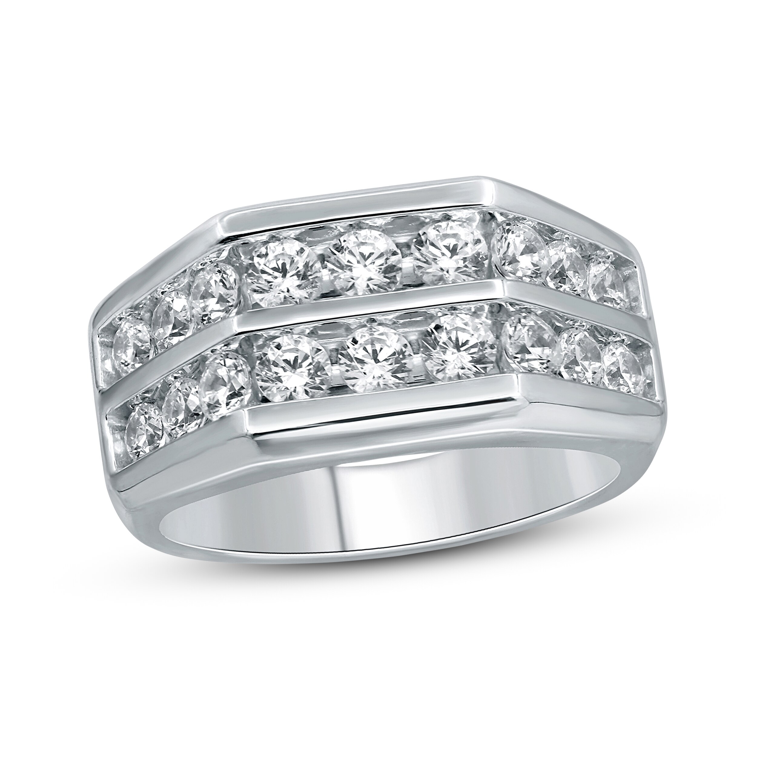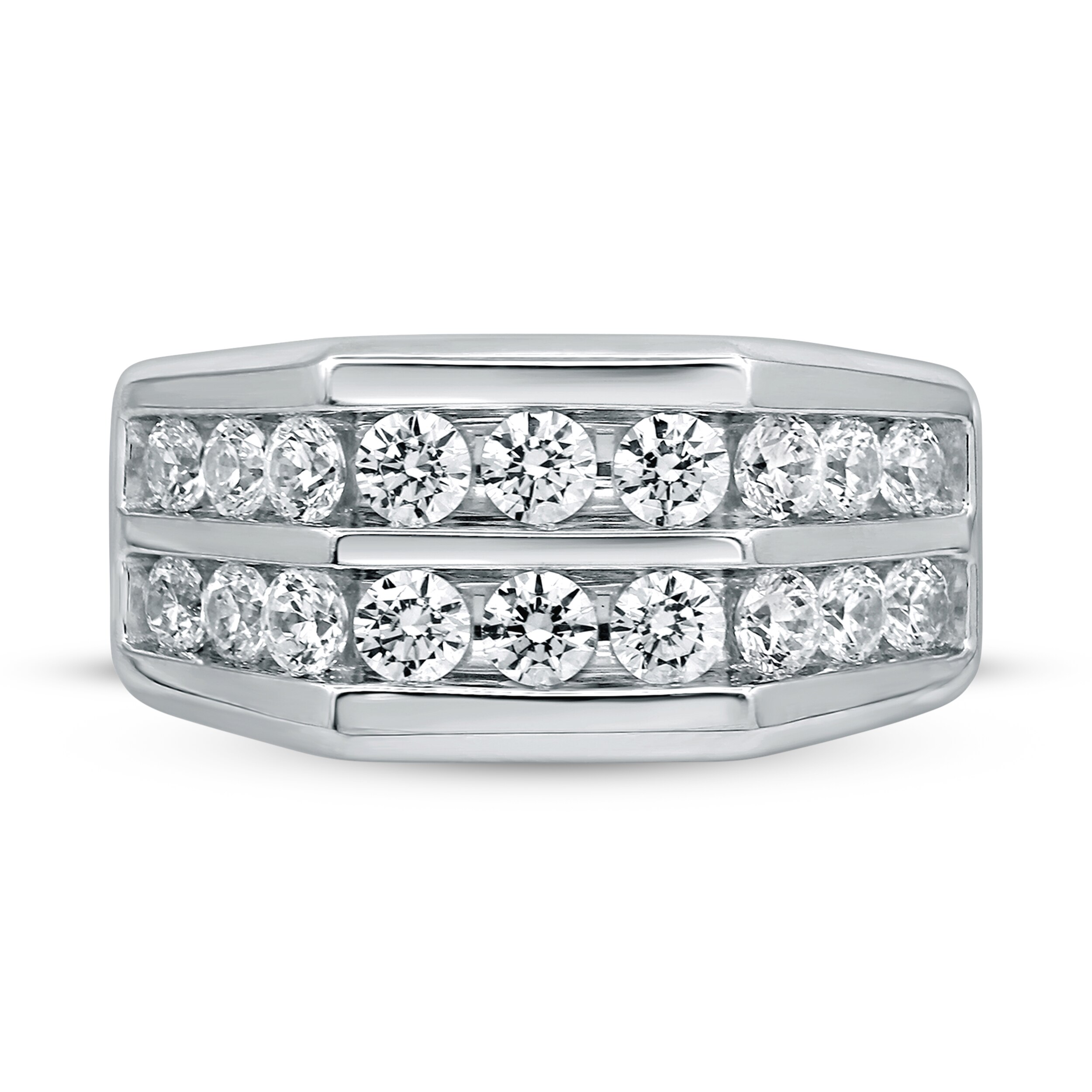 This distinctive men's wedding band features two rows of bold round diamonds. The ring is fashioned in 10K white gold and has an impressive total diamond weight of 2 carats.