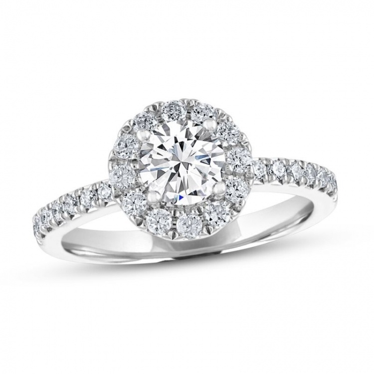 Shimmering round diamonds halo a brilliant round diamond at the center of this eye-catching Diamond engagement ring. Additional diamonds line the 14K white gold band to bring the ring’s total diamond weight to 1 1/8 carats.