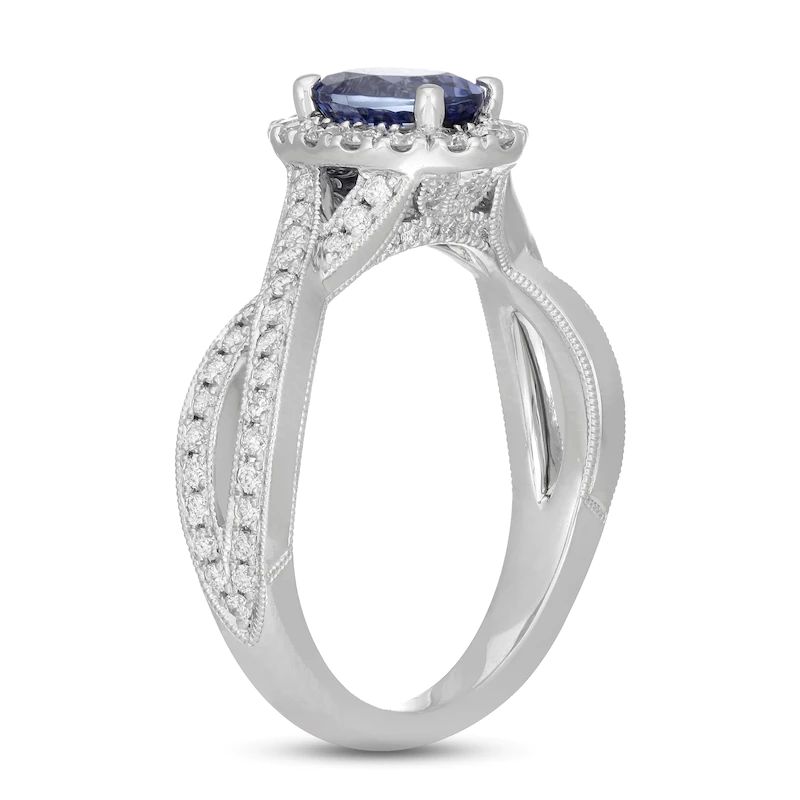 A vivid oval-cut tanzanite draws the eye to this splendid engagement ring. Radiant round diamonds halo the center and shimmer down the twisting 14K white gold band for a total diamond weight of 5/8 carat.